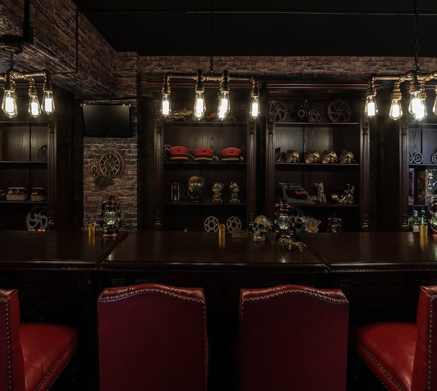ぼんやりと薄暗いエジソンランプの向こうでは夜な夜な秘密の会議でも開かれているのだろうか?重厚なアンティークウッドのカウンターチェアは贅沢なまでに大人のアヴァンギャルドな気分に浸れることであろう。